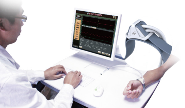 中醫(yī)脈象診斷系統(tǒng):利用計(jì)算機(jī),通過袖帶式傳感器,傳感器自身重量≤50克,在橈動(dòng)脈寸,關(guān),尺三個(gè)部位檢測(cè)脈象信號(hào),模仿中醫(yī)醫(yī)師指法,(傳感器Φ8圓形)更準(zhǔn)確的按照中醫(yī)舉、按、尋的診脈過程,浮、中、沉散布全自動(dòng)氣體加壓取脈,采集八個(gè)不同壓力段的脈象波形自助選擇佳壓力波形,并將脈象的位,數(shù),形,勢(shì)和脈圖的各項(xiàng)參數(shù)自動(dòng)分析,以判定脈象信息,用于臨床脈象檢測(cè)。